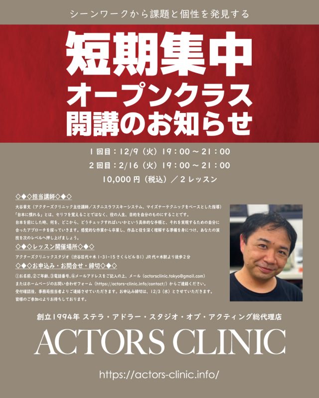 シーンワークから課題と個性を発見する【短期集中オープンクラス】開催(12/9,16)のお知らせ