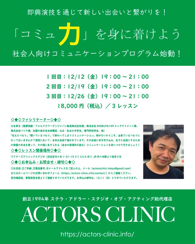 アクターズクリニックではこの度、演技メソッドを活用した社会人向けコミュニケーション力育成プログラム【コミュニケーションプログラムクラス】を開催いたします。